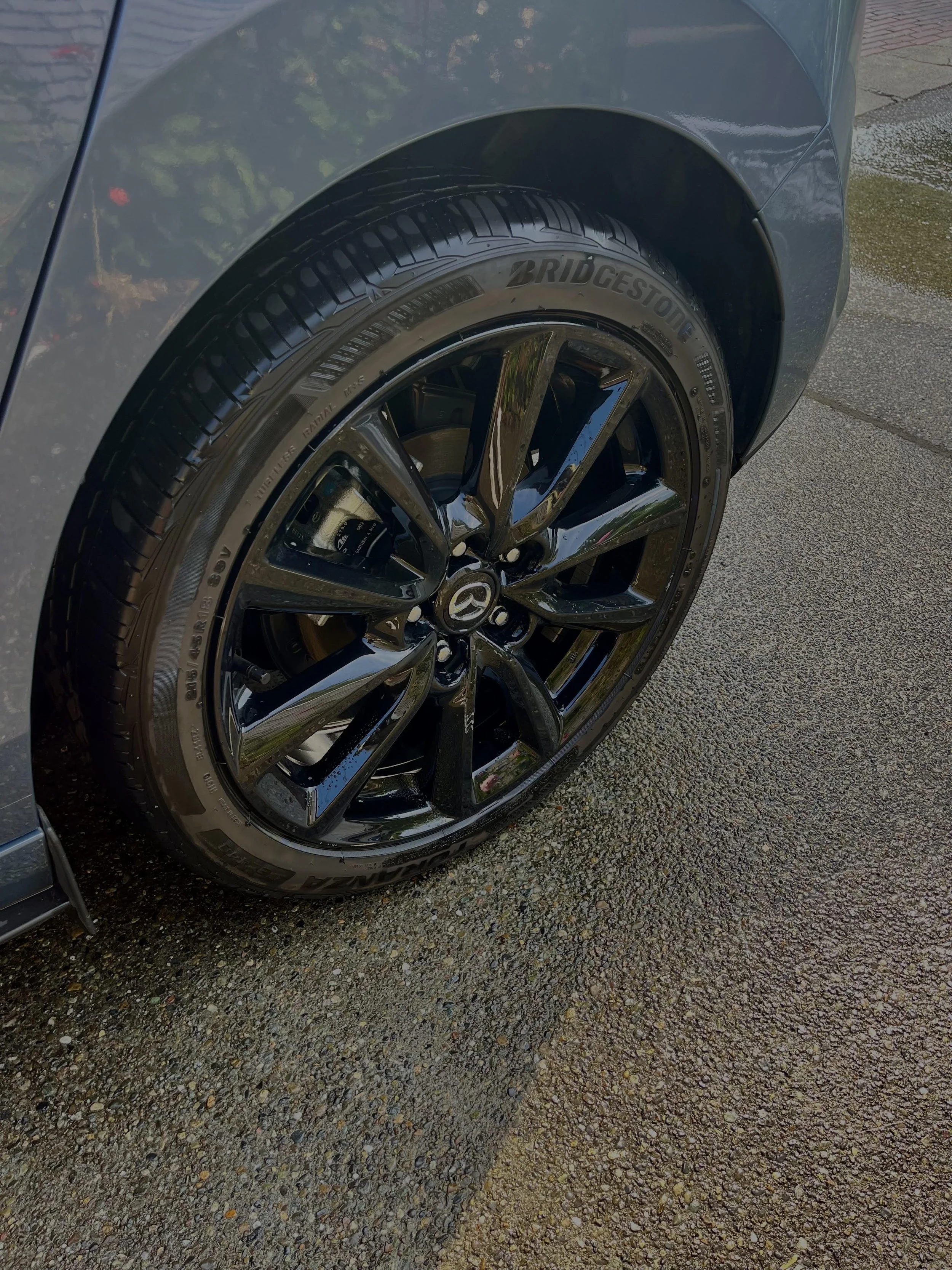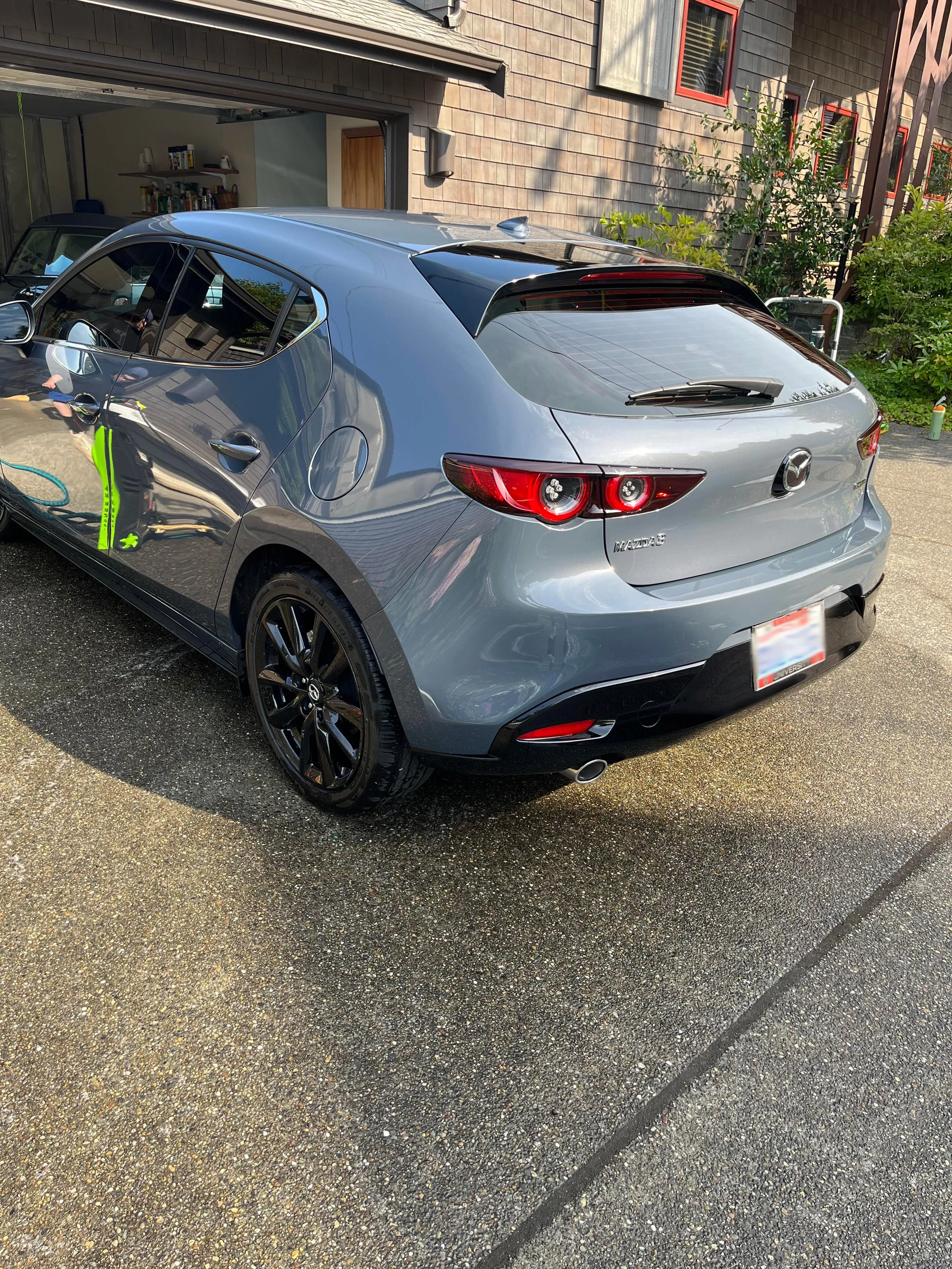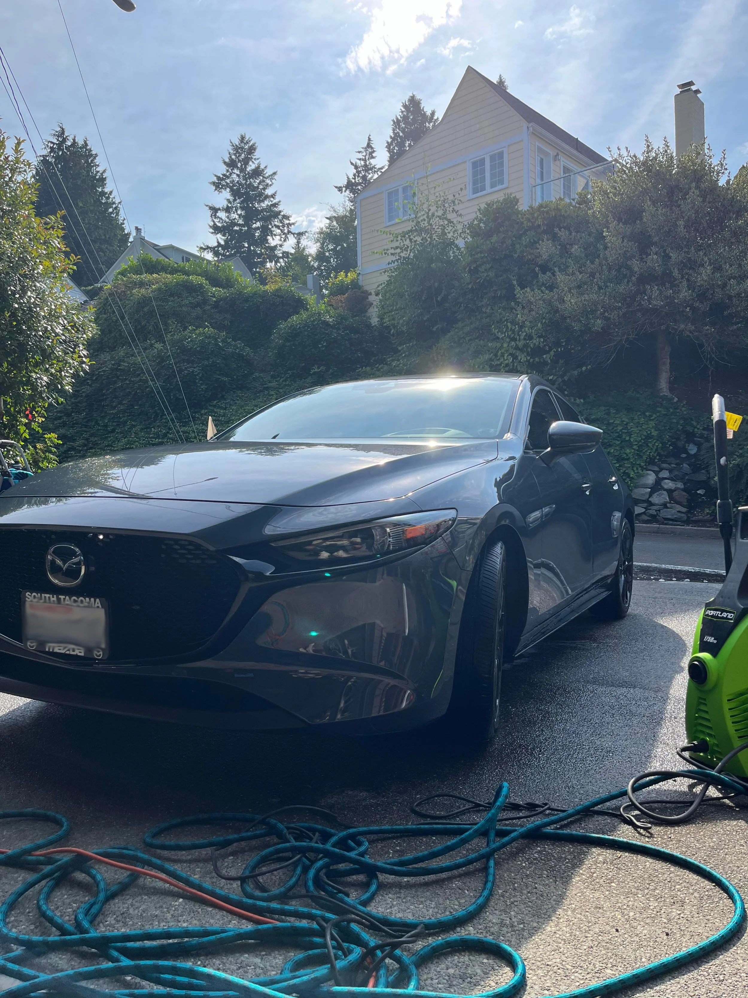 Mazda car parked on driveway, surrounded by greenery and house, with car wash equipment nearby.