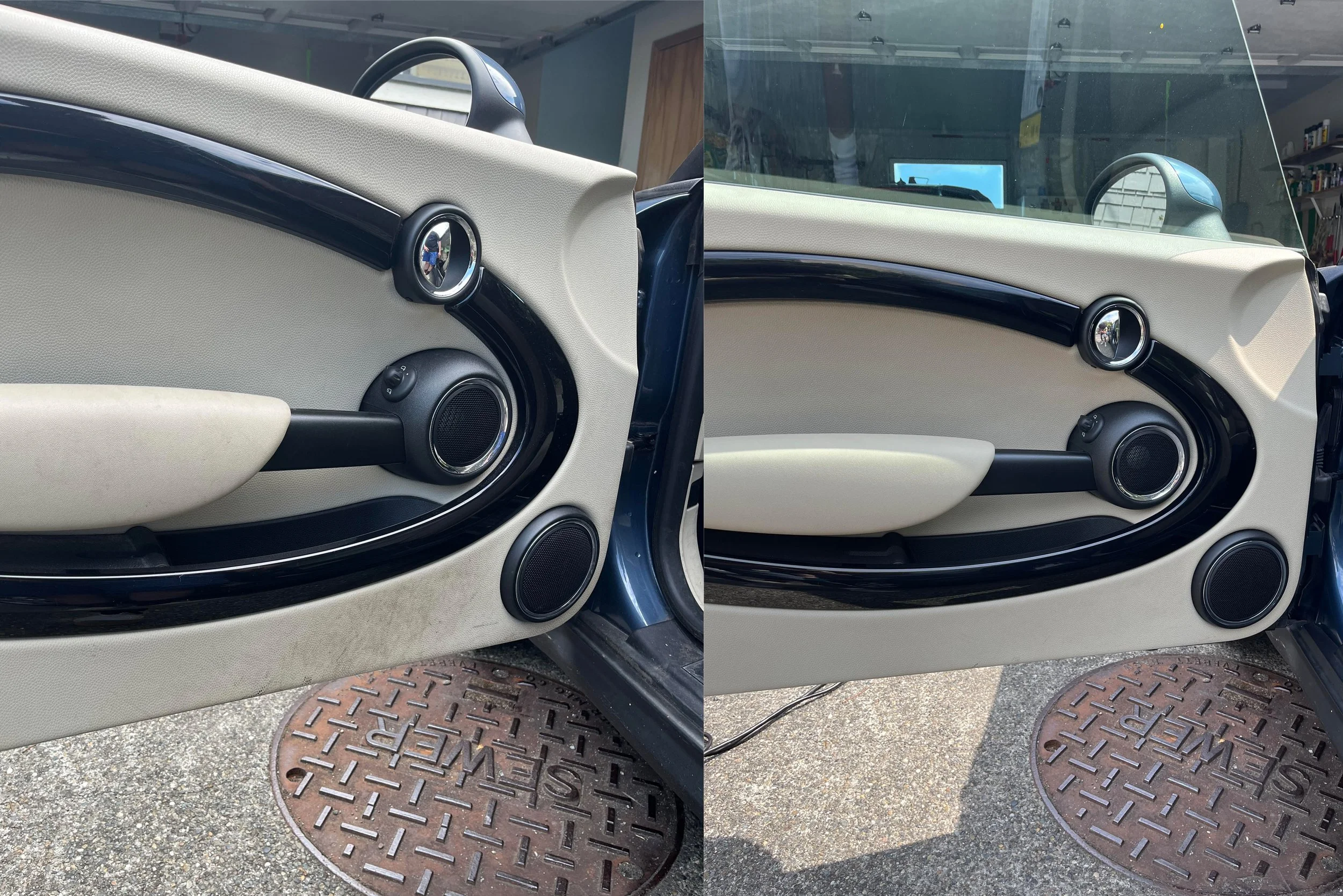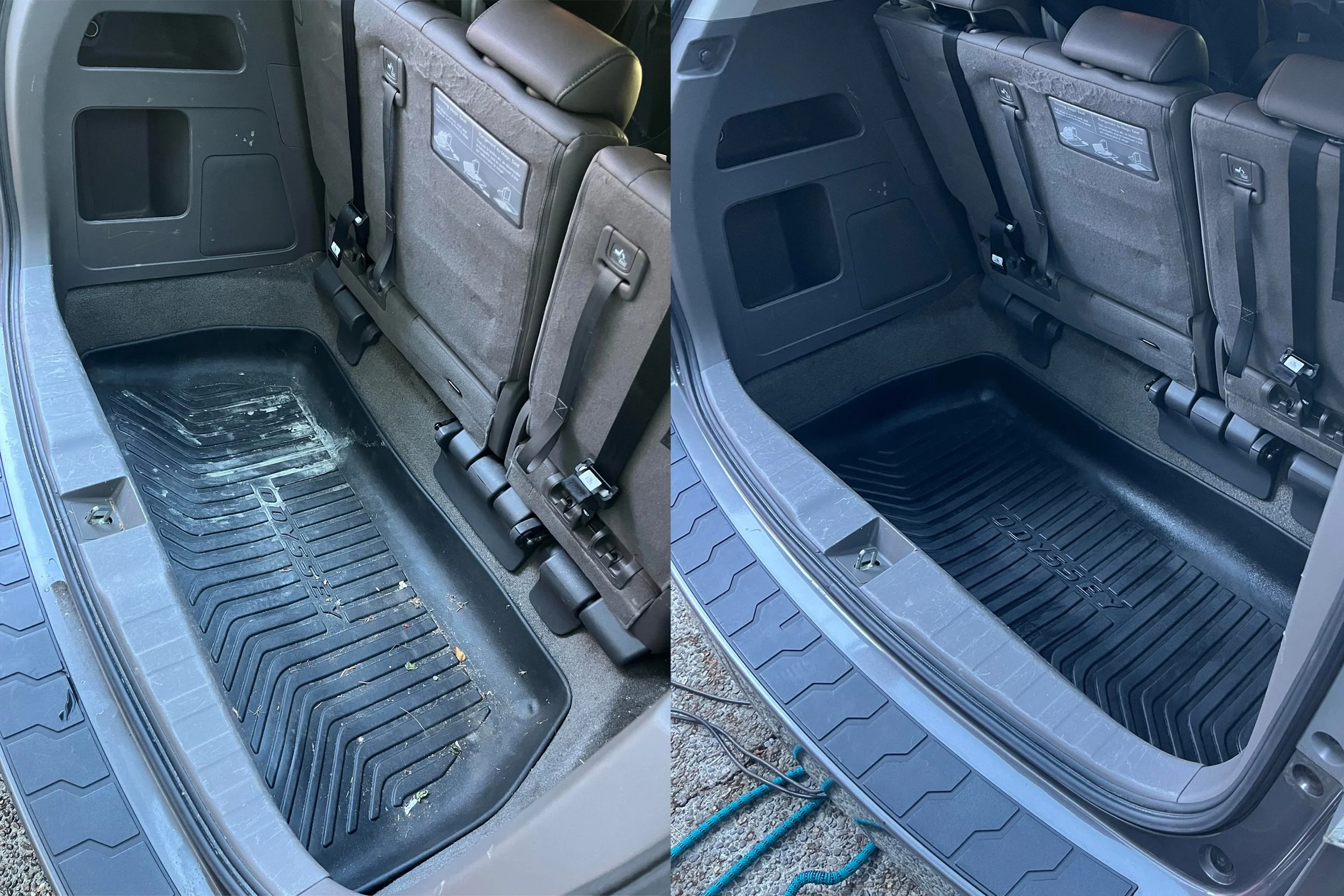 Car glove compartment and floor mat, Toyota Corolla S, before and after cleaning comparison.