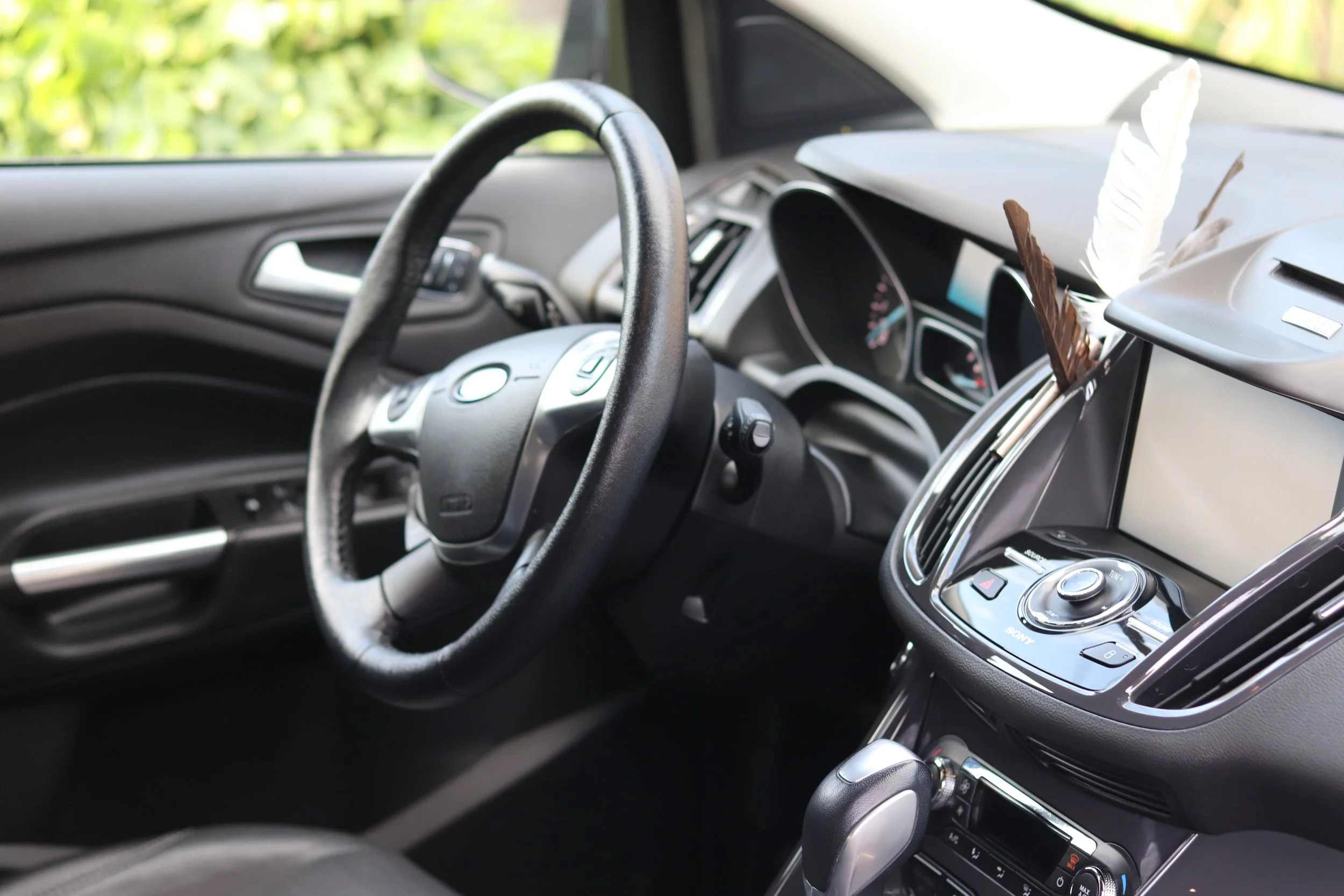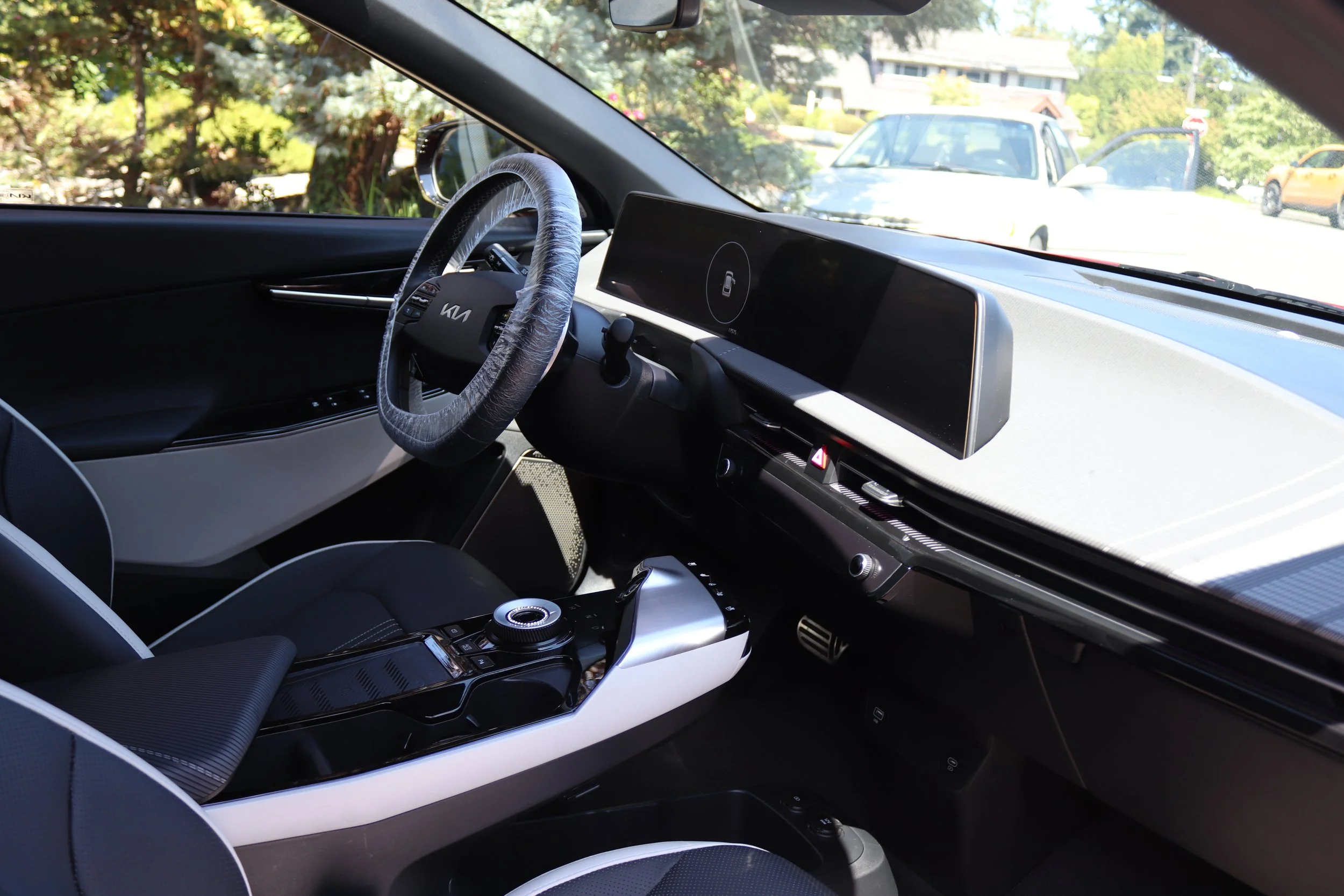 Interior of a modern Kia electric car showing dashboard and steering wheel.
