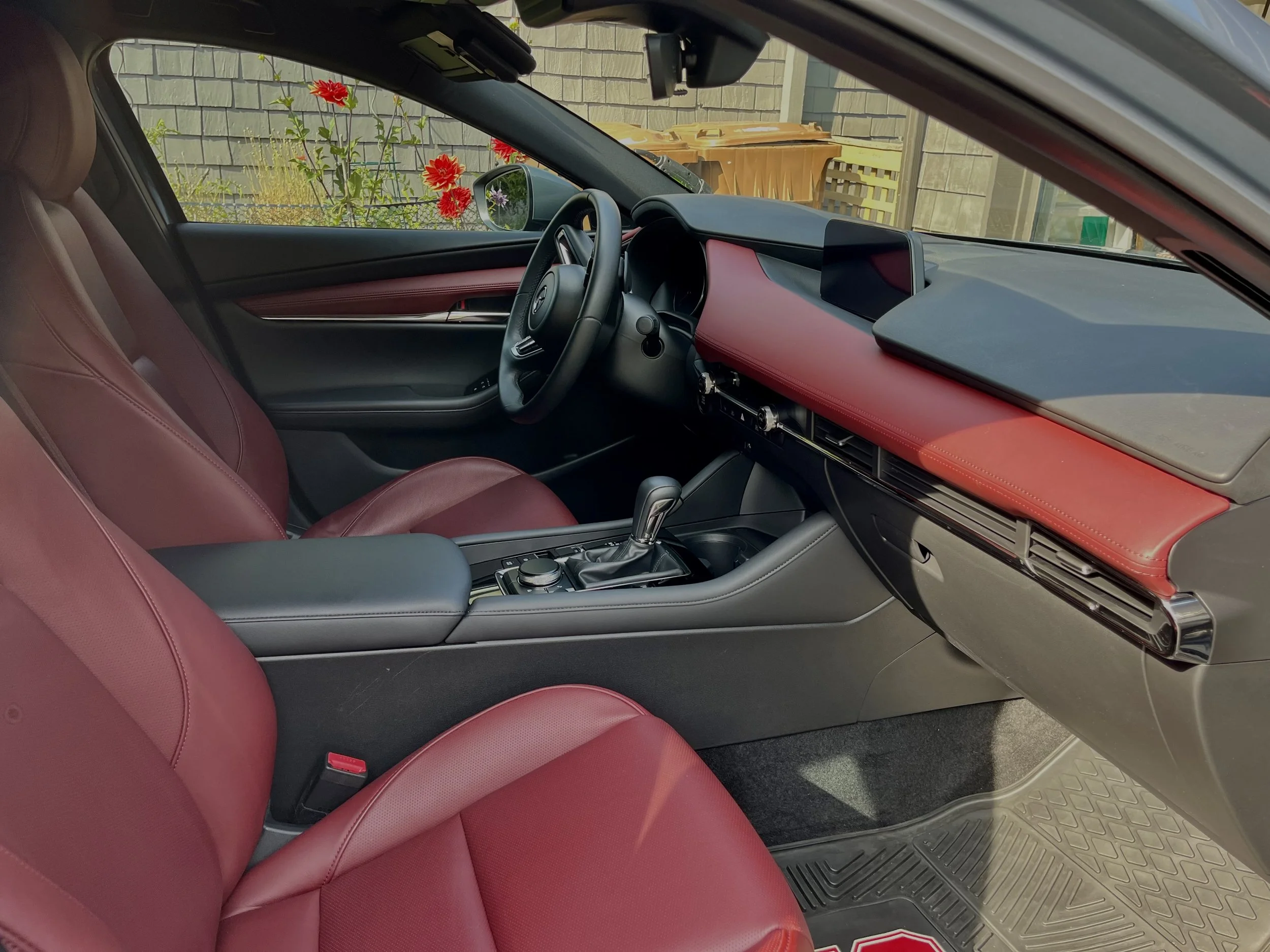 Car interior with red leather seats and dashboard, black trim, gear shift, and outdoor flowers visible through window.