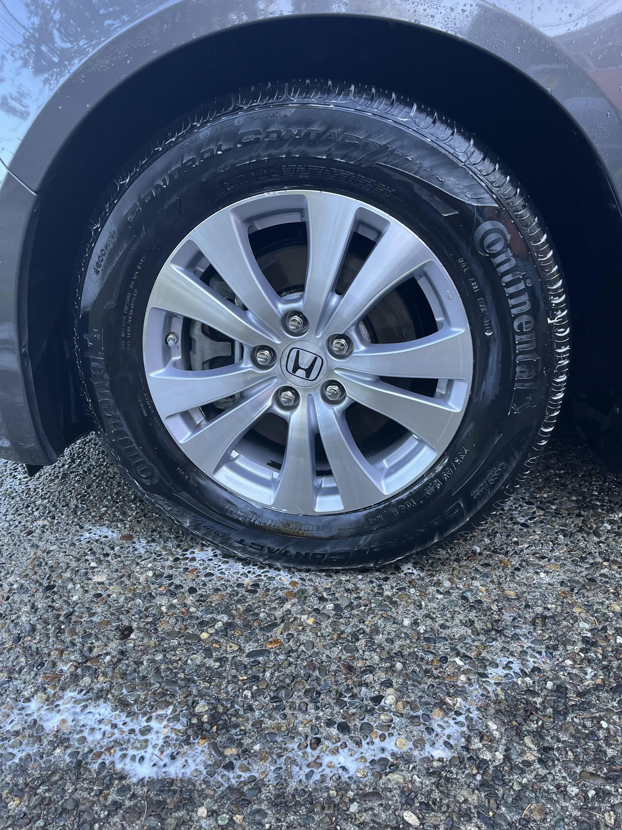 Close-up of a car tire with a Honda logo on the wheel and a Continental tire brand. The car is parked on wet, pebbled pavement.